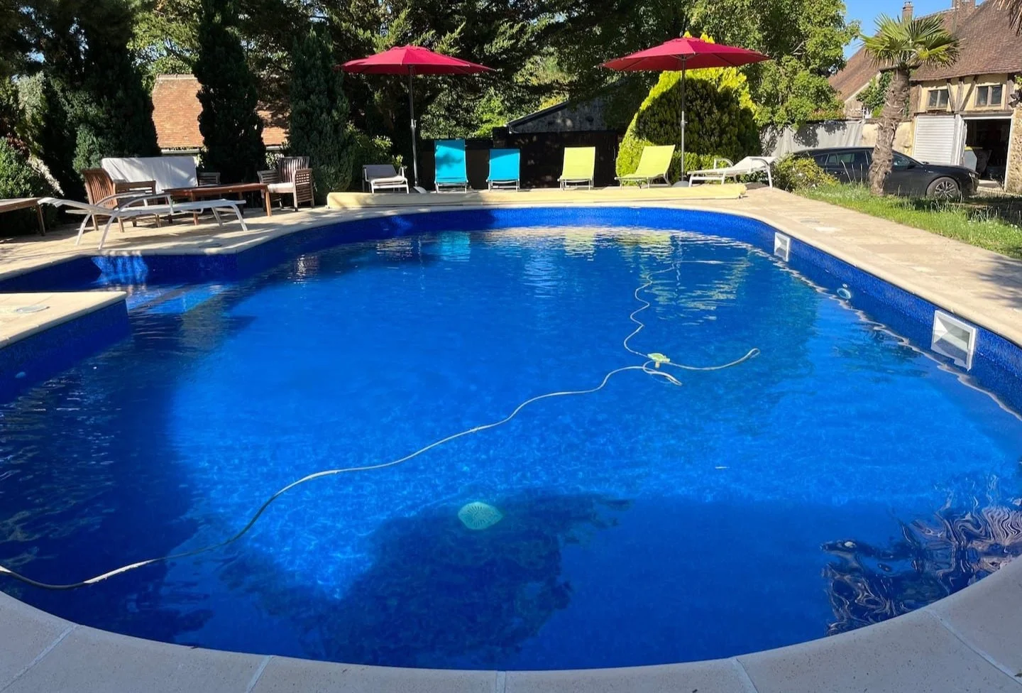 Une piscine adaptée à la taille de la maison, offrant toute la sécurité attendue pour les enfants (1m20 de profondeur sur toute la surface, et 10m x 6m)
